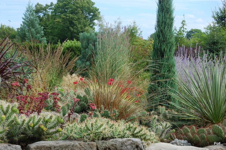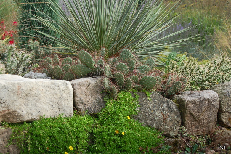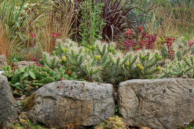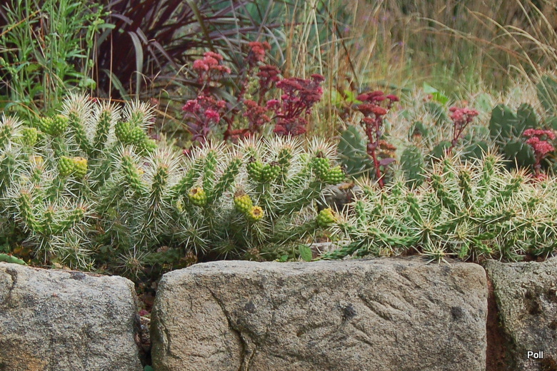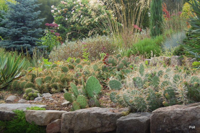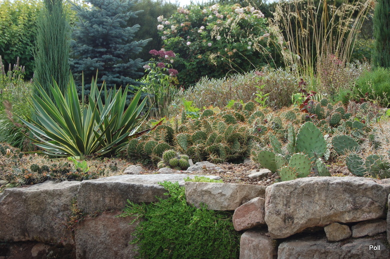 Pięknie skomponowane suche rabaty w Szkółce Grochowscy w Radkowie... Wśród roślin wielkie, zdrowo rozrośnięte kępy różnych opuncji , które nigdy - według słów właściciela - nie były przykrywane. Zdjęcia były robione 04.09.2016r, więc zamiast kwiatów, widzimy zawiązane owoce.
