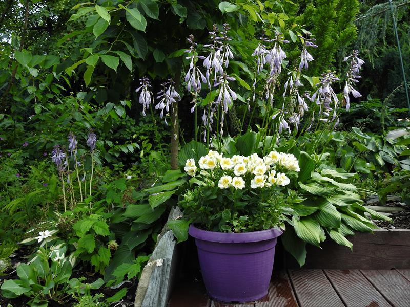 Mój tegoroczny nabytek na razie paraduje się w donicy przy tarasie. Zauważyłam, że jest bardzo lubiany przez ślimaki. Kilka niebieskich granulek poszło pod roślinę.