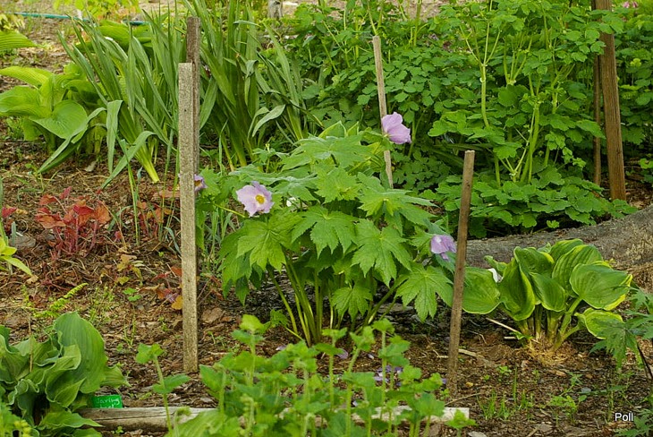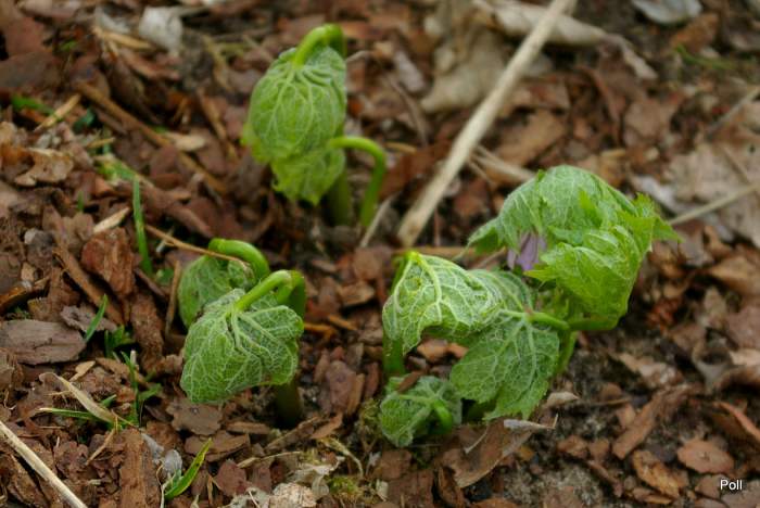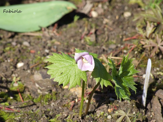 W ubiegłym roku , kiedy opadły na nas pierwsze przymrozki, glaucidium dopiero wychodziło z ziemi i nic złego mu się nie stało.Po zapowiedziach następnej fali zimna, ochroniłam je włókniną podwieszoną na czterech kołkach tak wysoko, by nie dotykało rośliny. Końce włókniny przycisnęłam do ziemi kamieniami i kawałkami drewna. Teraz włókninę zdjęłam, ale kołki zostawiłam...na wszelaki słuczaj.