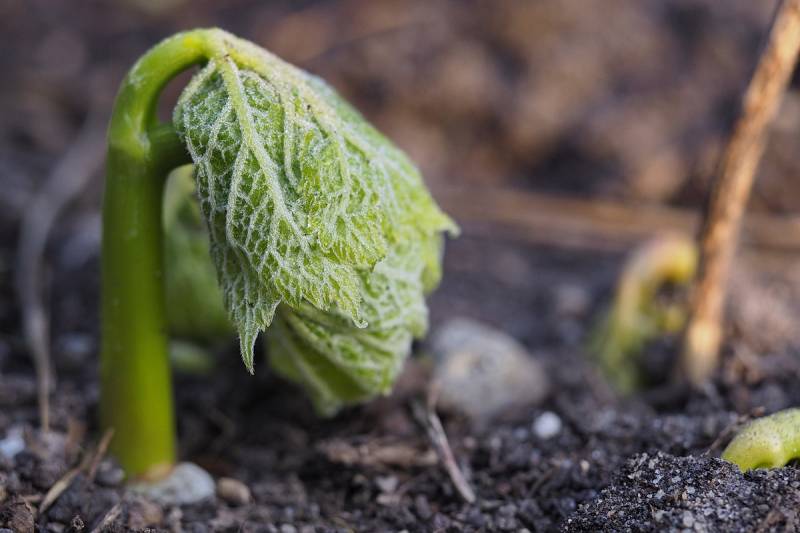 Moje Glaucidium palmatum już ruszyło. Nad powierzchnią ziemi pojawiły się charakterystyczne, błyszczące pierścienie zwiniętych łodyg