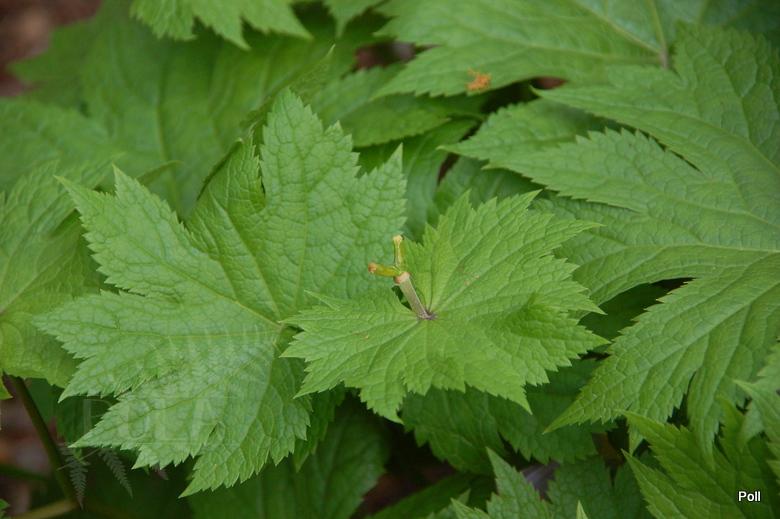 Kwitnienie Glaucidium palmatum dobiega powoli końca a nad liśćmi pojawiły sie nasienniki w kształcie podkuwek.