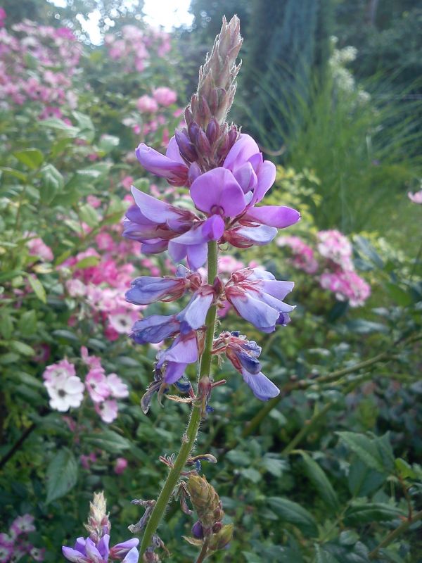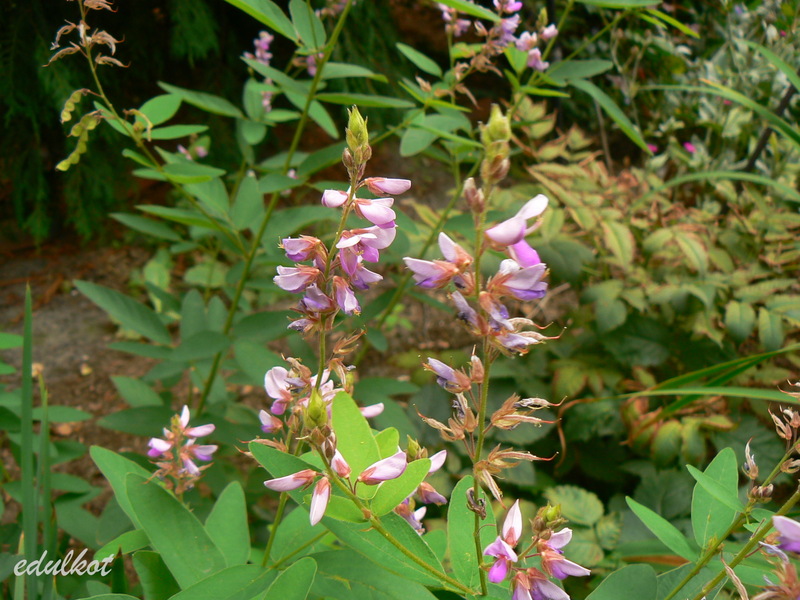Kwiaty: w kształcie charakterystyczne dla roślin z rodziny bobowatych, barwa oscyluje wokół różów i fioletów