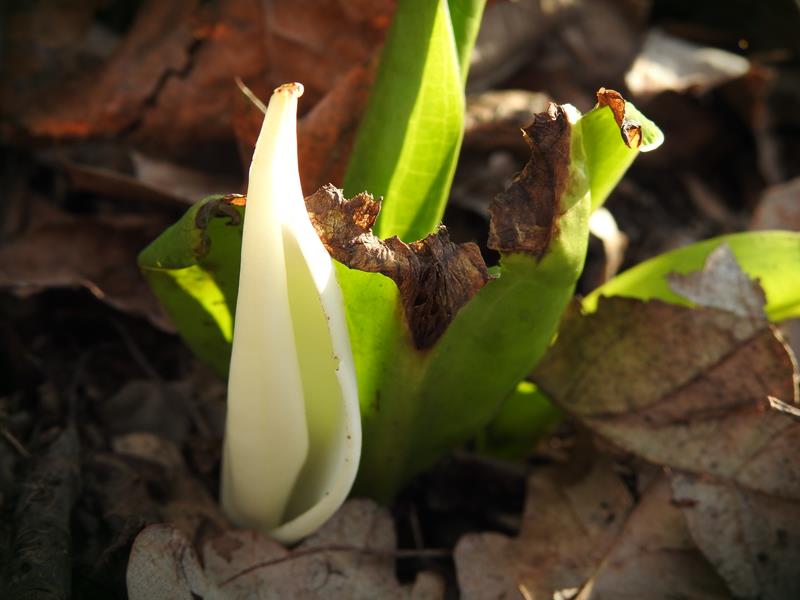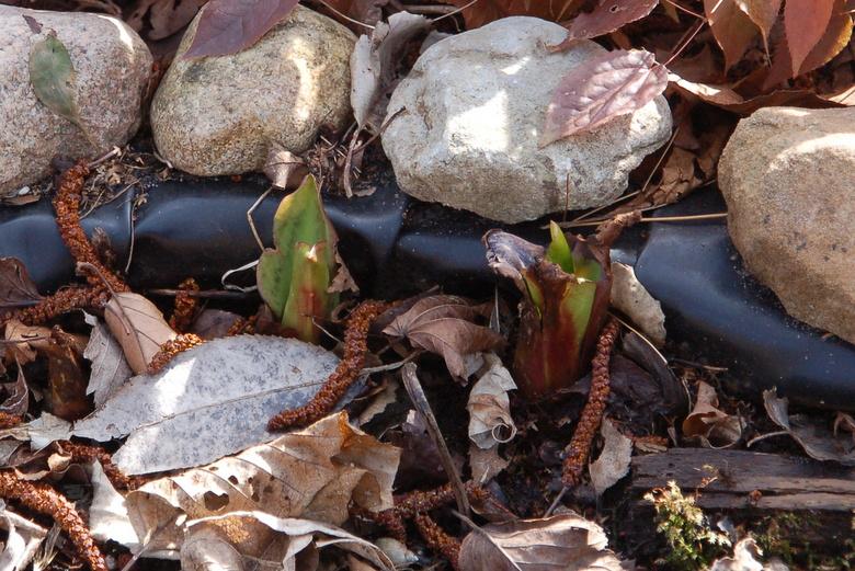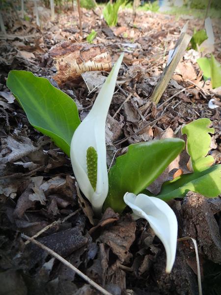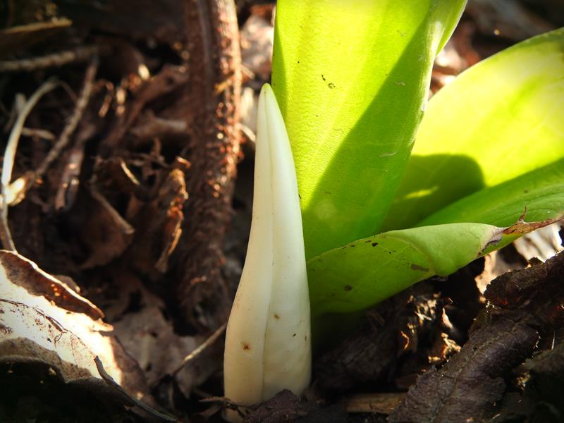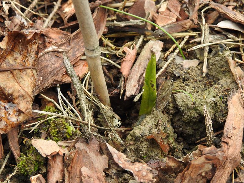 13.04 2018 - pąki tulejnika amerykańskiego i kamczackiego zaczęły się wysuwać i wybarwiać. Na zdjęciu białokwiatowy tulejnik kamczacki