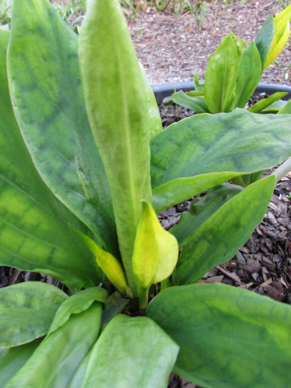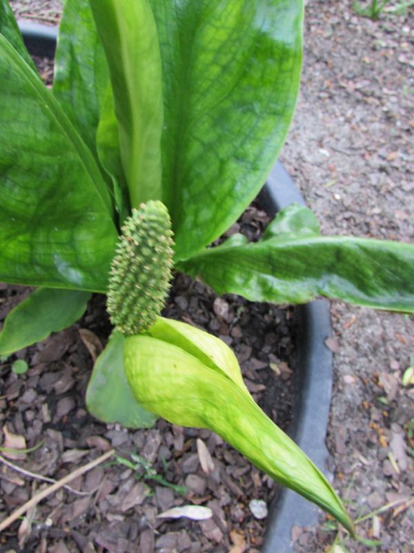 kwitnienie tulejników w Berlinie, to prawdziwy spektakl, tak, jak i w Harlow Carr (powinnam dodać zdjecia :glupek ), ale i ja doczekałam się szczęśliwego momentu. W tym roku oba tulejniki zaszczyciły mnie kwitnieniem. Każdy z nich ma co najmniej 3 kwiaty! hu_rra hu_rra Napisałam 'co najmniej', bo wydaje mi się, że zwinięty liśc tulejnika amerykańskiego kryje jeszcze jeden kwiat. Oba rosną w bagienku, które stale, nawet latem, staram się ciągle zasilać w wode, tak, by utrzymywała się w małej ilości nad ziemią. Dno bagienka wyłożone jest nieszczelną folia, bo nie ma być oczkiem wodnym :lol: