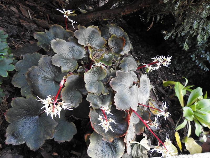 Roślina o stu obliczach - Saxifraga fortunei 'Silver Velvet' . Ta skalnica w ciągu sezonu zmienia wybarwienie kilka razy... Za każdym razem jest ciekawsze a kwiaty, to tylko dodatek do udanej całości. To prezent od syna - dany chyba od serca, bo ładnie kwitnie i rośnie w siłę bezproblemowo.