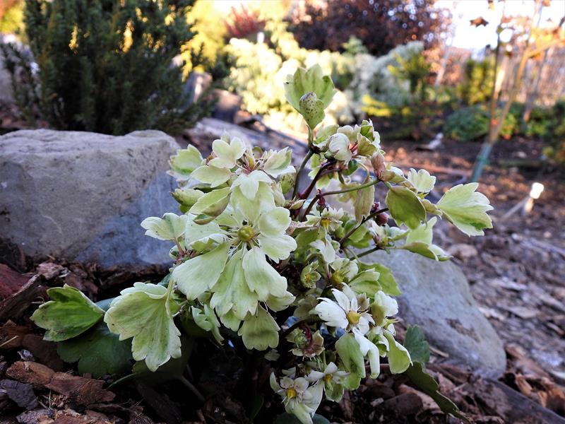 Wszystkie moje skalnice zostały ścięte przez zbyt wczesne, wrześniowe przymrozki, ocalała tylko młodziutka Saxafraga fortunei Hiougi. Osłoniły ją zwieszające się liście paproci recourse , ale nie całą- ocalała tylko środkowa część rośliny.