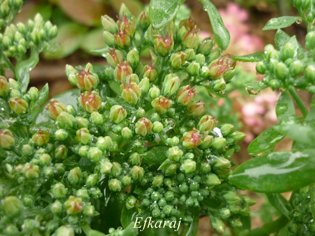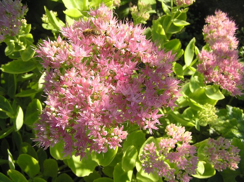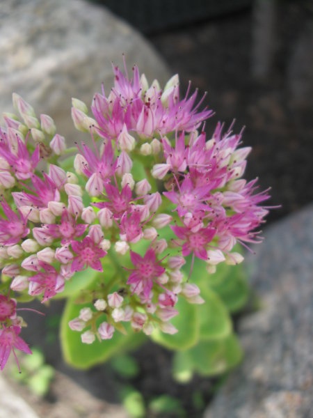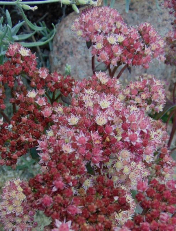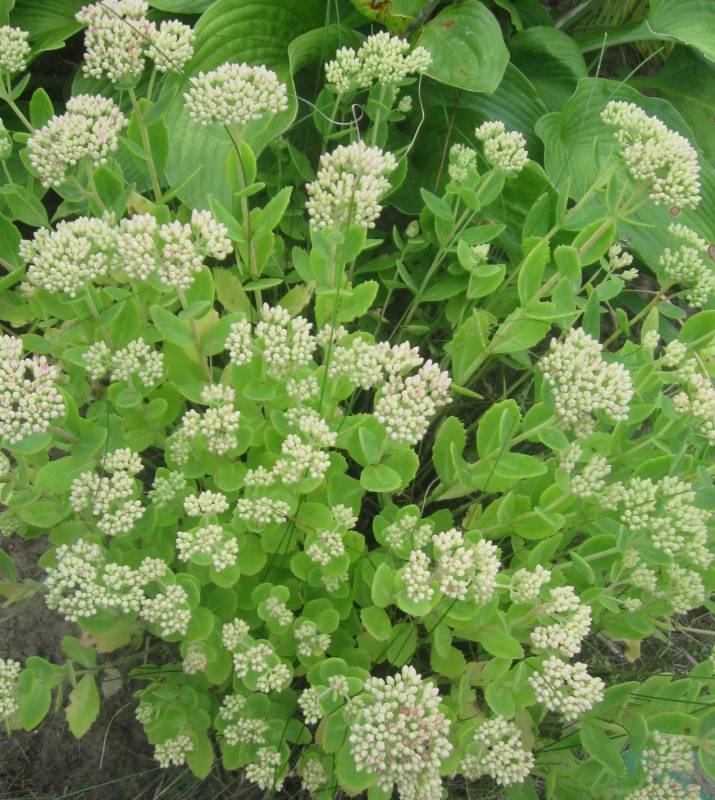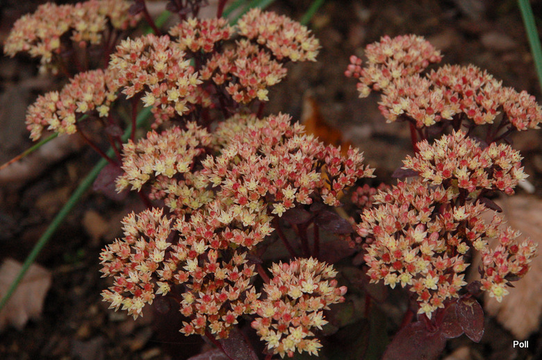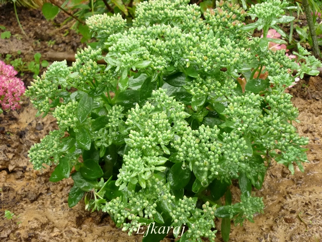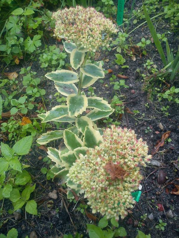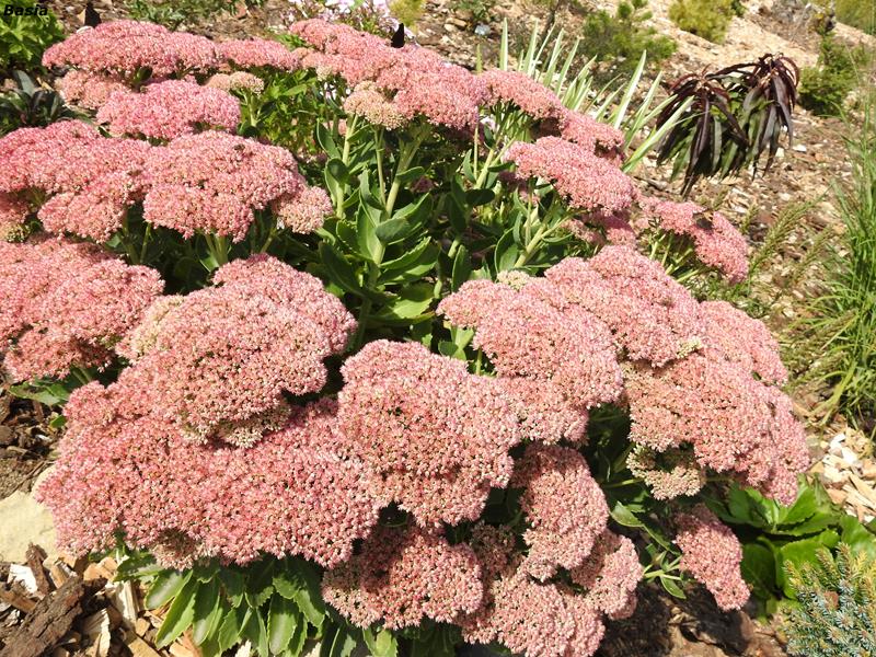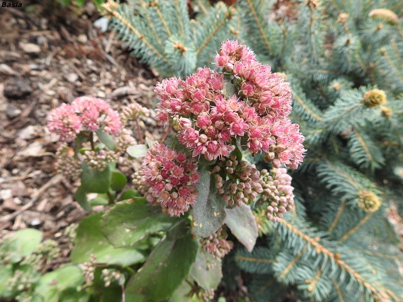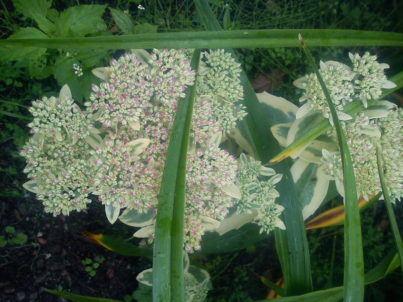 Kwiaty pojawiają się od sierpnia i kwitną do mrozów. Z początku zielone, w miarę rozkwitania przebarwiają się do ciemno-różowych. W bardzo gęstych, spłaszczonych niby baldachach, pokrywają całą roślinę jak parasol.