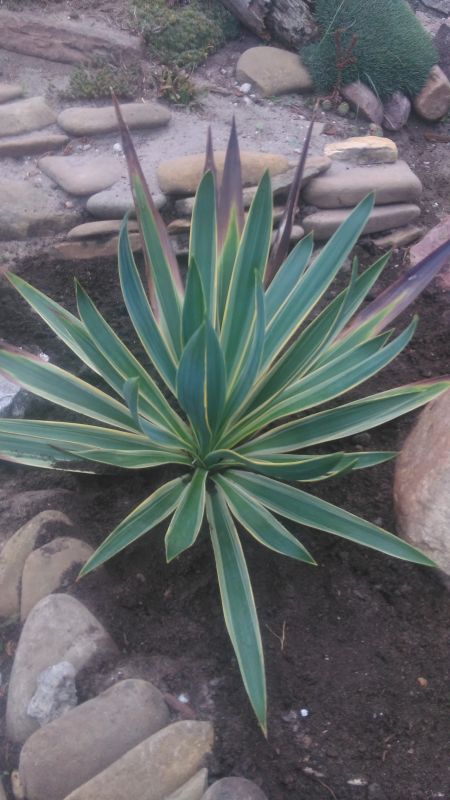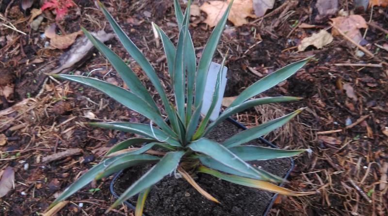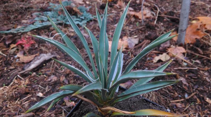 Liście sino zielone, rozszerzające się środkiem, sztywne, zakończone ostrym kolcem, do 20 cm