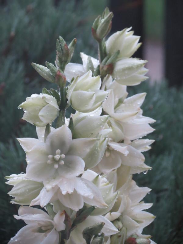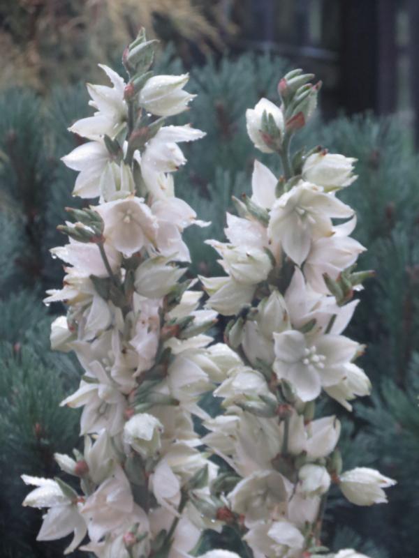Kwiaty nisko osadzone jak u juki sinej tylko kwiatostan znacznie mniejszy i bardzo zwarty, do 50 cm