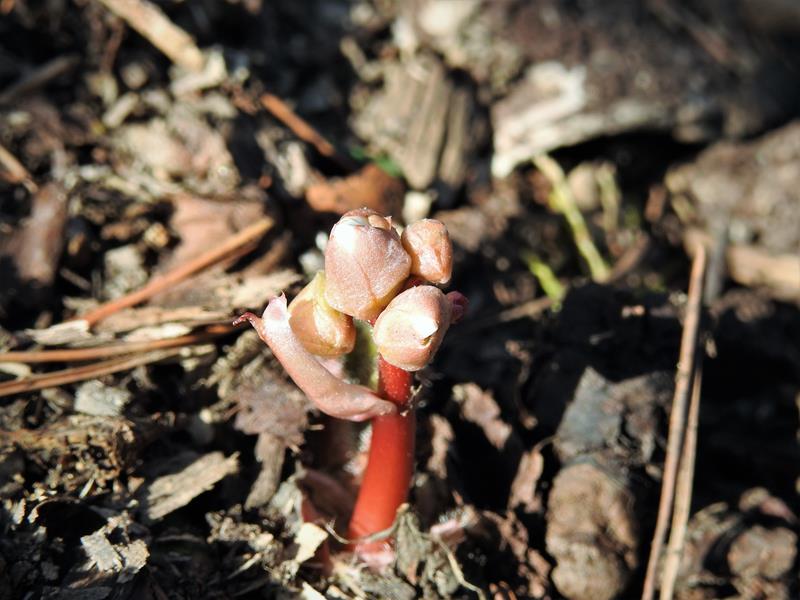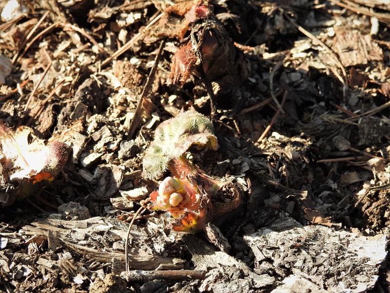 Wznawia wegetację bergenia orzęsiona Dumbo. Pierwsze pokazały się pąki kwiatowe na niewysokich łodyżkach.