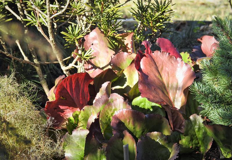 Cudowne zimowe kolory prezentuje Bergenia purpurascens 'Irish Crimson'. To obecnie najbardziej wyrazisty punkt na tej rabacie.