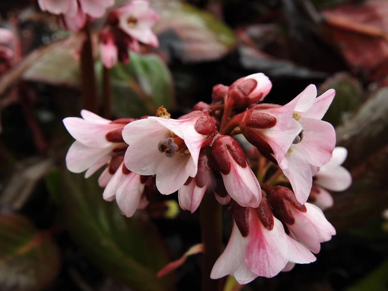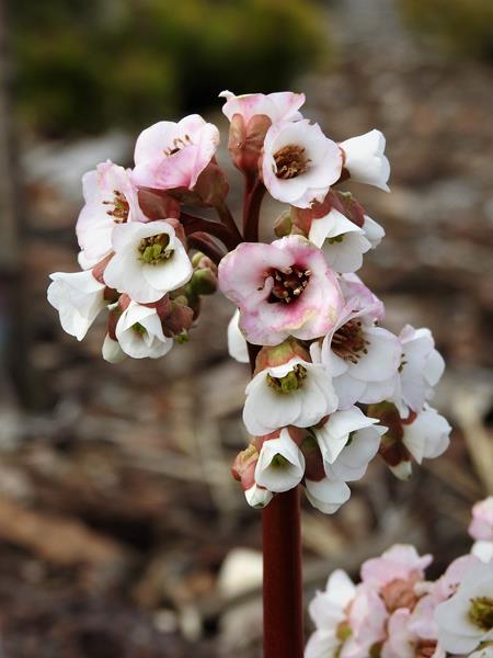 Kwitnie moja najwcześniejsza bergenia. W przypadku tej odmiany często się niestety zdarza, że kwiaty są niszczone przez przymrozki.