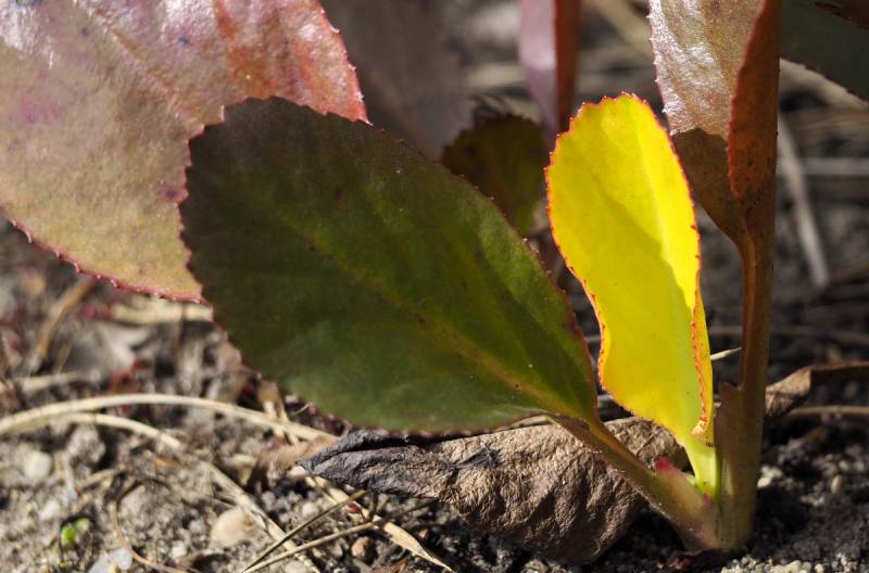 Wyjątkowo, Bergenia ciliata nie zostałą do szczętu zniszczona przez mrozy, co jest zapewne zasługą pokrywy śnieżnej podczas największych mrozów.
