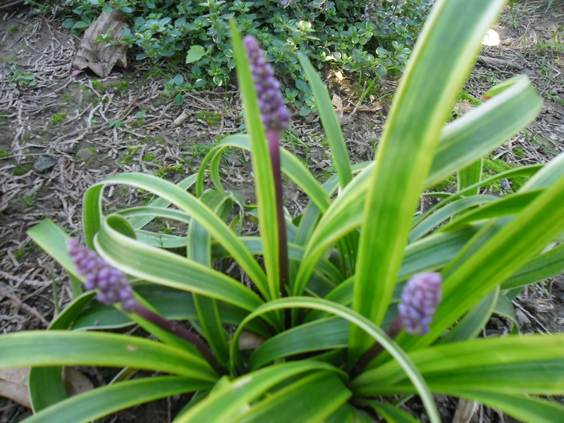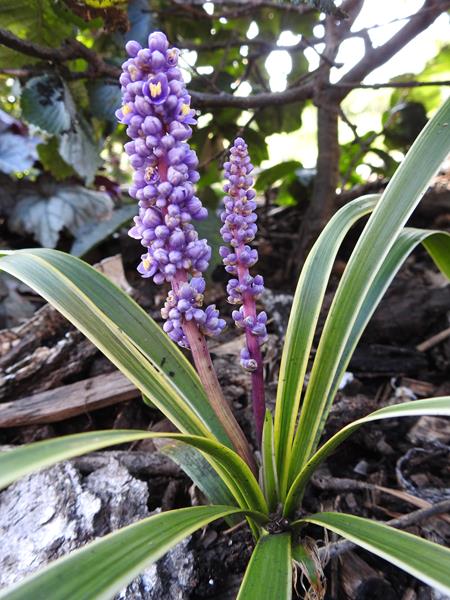 Zakwitło Liriope muskari Variegata.Miejsce z popołudniowym słońcem