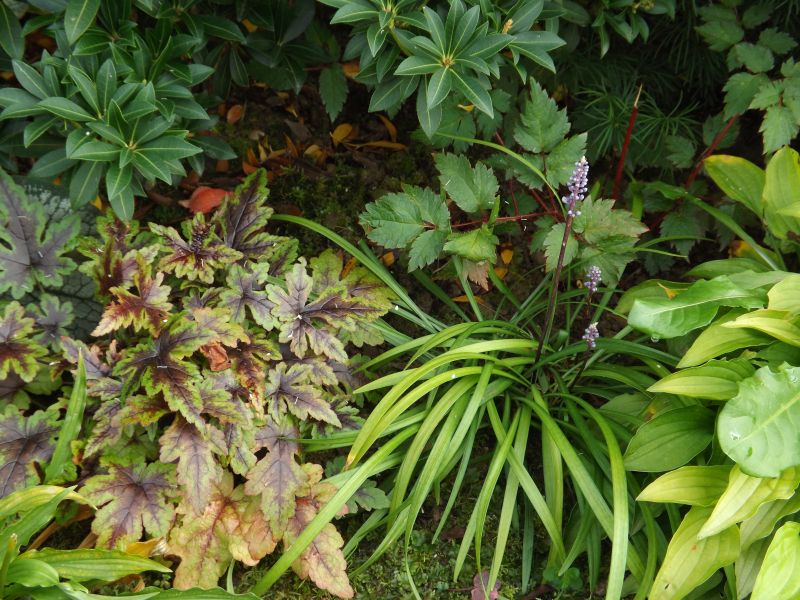 Efciu liriope miałam posadzone w przedogródku, w cieniu bukszpanu i świerka serbskiego czyli w otoczeniu pijaków. Rosły słabo, jeszcze słabiej kwitły. Rok temu przesadziłam je pod parasol sosny w otoczeniu host i paproci, rozrosły się obie, ale kwitnąć "Ingwersen" nie chciał, może w następnym sezonie będzie lepiej.