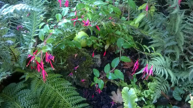 Fuksja magellańska 'Ricartonii' w jasnym półcieniu, między hostami i paprociami
