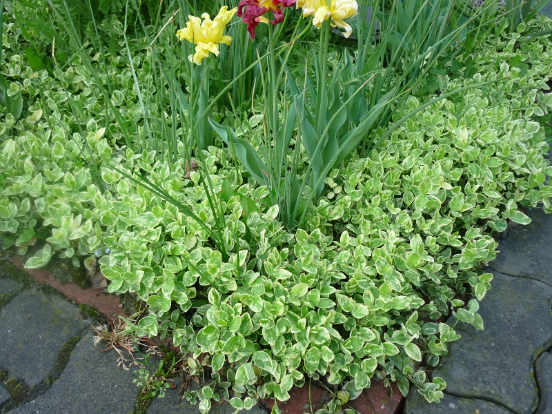 Mój Vinca major'Variegata' swoją pierwszą zimę przetrwał w doskonałej formie, przeczytałam wcześniej na forum, że długie pędy mogą przemarzać i przysypałam je liśćmi. Wiosną wypuścił się na kilka metrów, ukorzenił, ale kwitł tylko kilkoma kwiatkami.