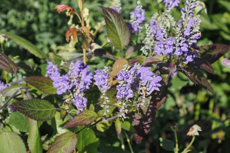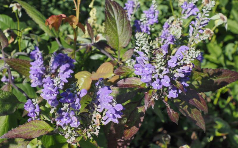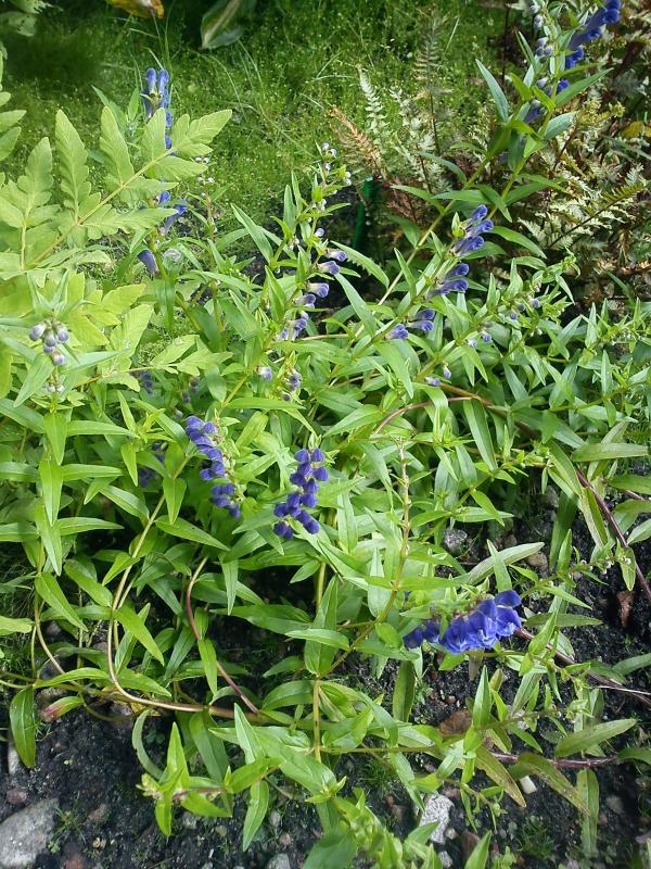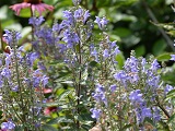 Kwiaty : 2,5 cm, niebieskie lub purpurowe, z jasną plamą wewnątrz. Zebrane w pojedyncze, długie grona. Kwitnie VI- VIII
