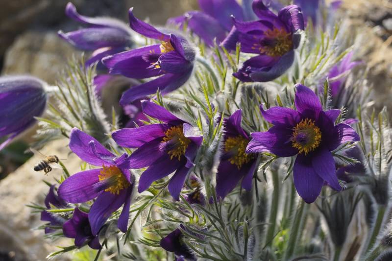 Dziś było słonecznie, więc owady chętnie oblatywały kwiaty sasanek.