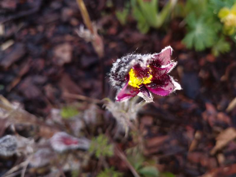 Pierwsze kwiaty sasanek przemarzły, ale teraz rozwijają się te na chłodniejszych stanowiskach m.in. 'Papageno' kupiona 2 lata temu w sklepie przy ogrodzie RHS Harow Carr. Wybrałam ją, bo w jednej donicy miała dwa różne kwiaty. I tak też kwitnie w tym roku :lol: