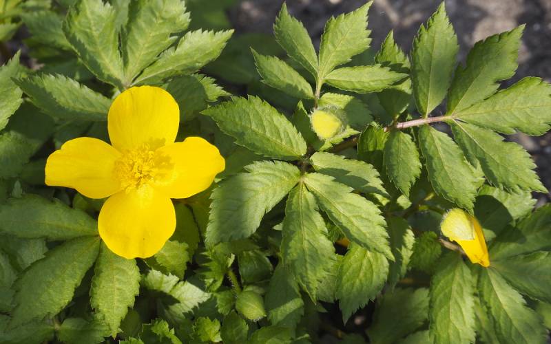Rozrasta się za pomocą kłączy, tworząc niewysokie, ale szerokie, dywanowe kępy o wysokości 20-30 cm. Kilku palczaste, ząbkowane liście maja jasnozielony kolor a czteropłatkowe kwiaty są żółte i dość spore , jak na roślinkę o tej wysokości - ich średnica wynosi 4-5 cm. Nasiona zebrane są w 'strzelających' strączkach, więc jeśli zamierzamy je wysiewać, należy przypilnować momentu, gdy dojrzewają.
