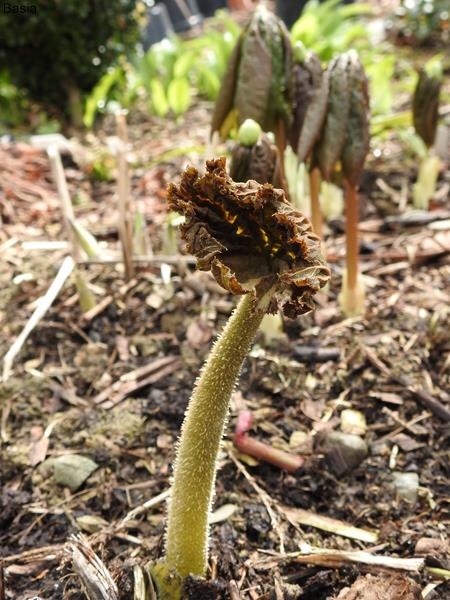 Wprowadzona kilka lat temu nowa hybryda pomiędzy Podophyllum Delavay i Podophyllum difforme, szybko zyskała uznanie kolekcjonerów i miłośników roślin. Dość odporna w naszym klimacie, chociaż w srogie zimy podmarza więc należy ją zabezpieczać przed mrozami. Wcześnie rozpoczyna wegetację. Zdjęcie z początku kwietnia.