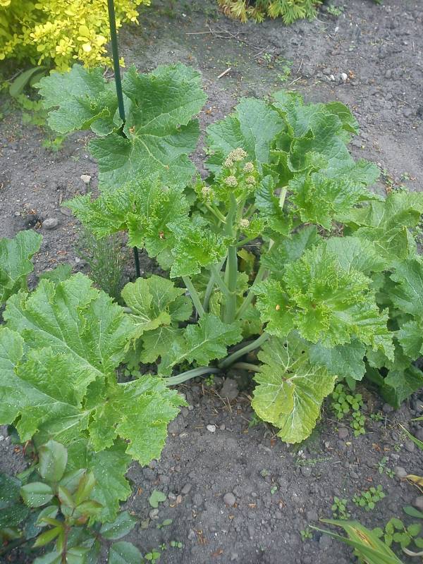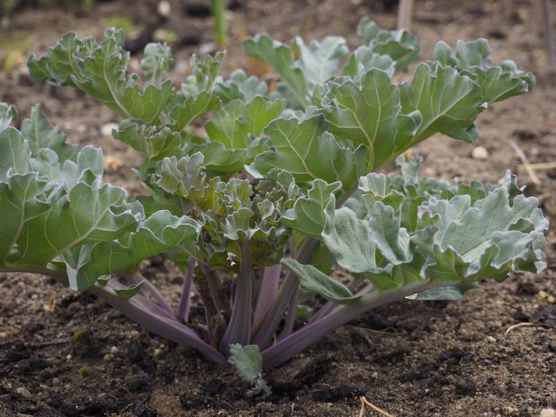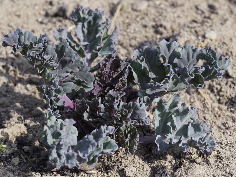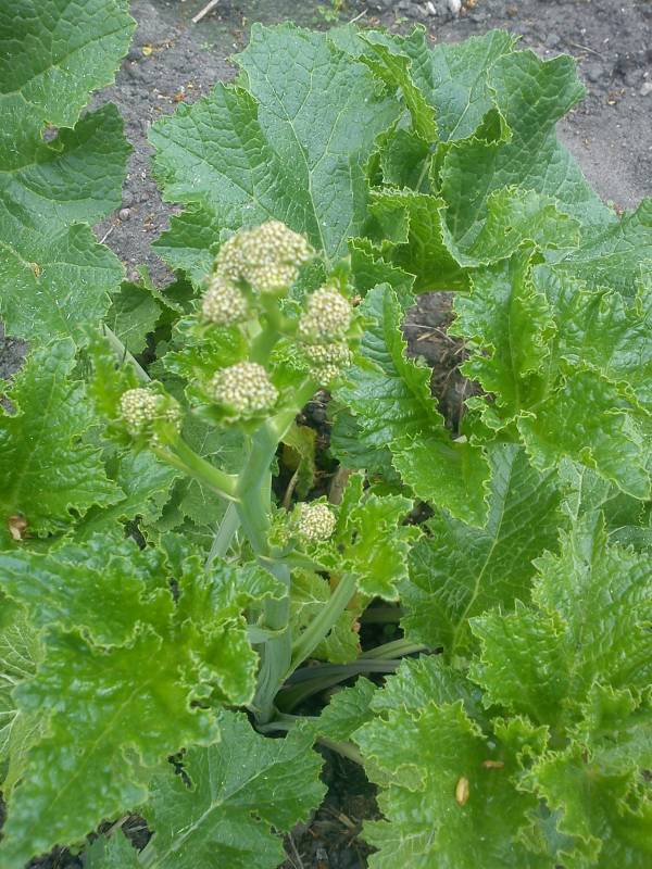 Liście duże, podłużne, pofalowane, poczatkowo purpurowo nabiegłe, potem niebiesko-zielone, wyglądem przypominają liście kapusty.