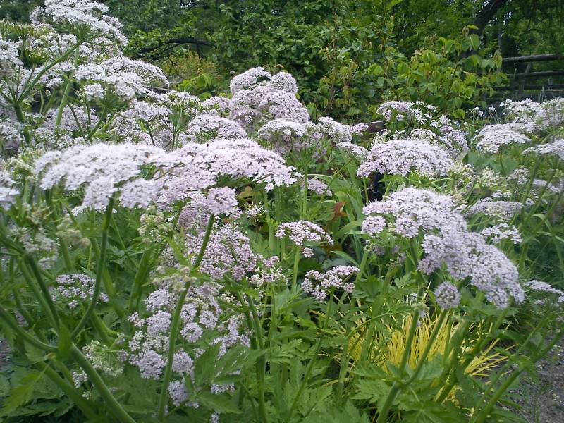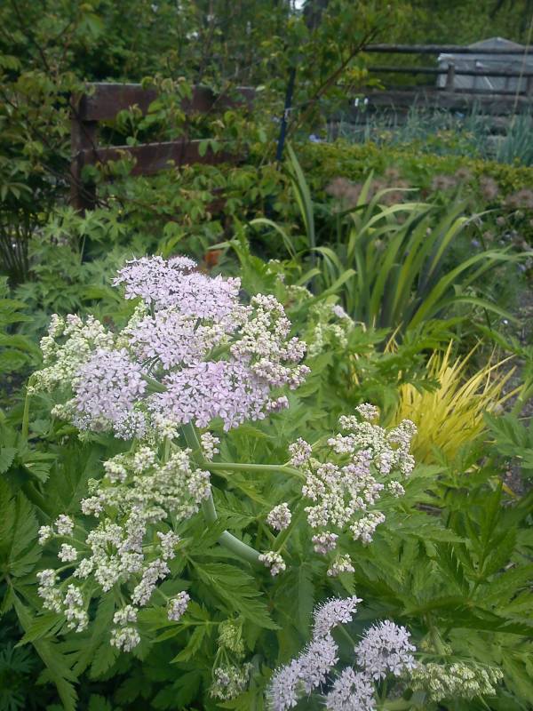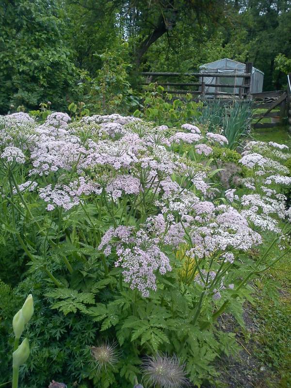 Kwitnie bardzo długo, teoretycznie zaczyna w czerwcu, ale w pierwszym roku uprawy mój zaczął już 1.05. Kwiaty drobniutkie, białe, zebrane w wielkich baldachach. Co ciekawe, u większości roślin pędy kwiatowe wyrastają wysoko, zakwitają na szczytach a potem pochylają się pod ciężarem kwiatów; tu jest inaczej: kwiaty rozwijają się w czasie wzrostu pędów i powoli dźwigają się wzwyż - robi to duże wrażenie za pierwszym razem.