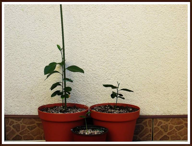Od lewej - cytryna, grapefruit i z przodu pomarańcza. Pierwsze dwa mam od kwietnia tego roku, a pomarańcza pojawiła się jakiś miesiąc temu. Są cały czas na balkonie - źle rosną. Grapefruit od 2 dni jest w mieszkaniu i zaczął rosnąć! Chyba nie lubi balkonu...;)