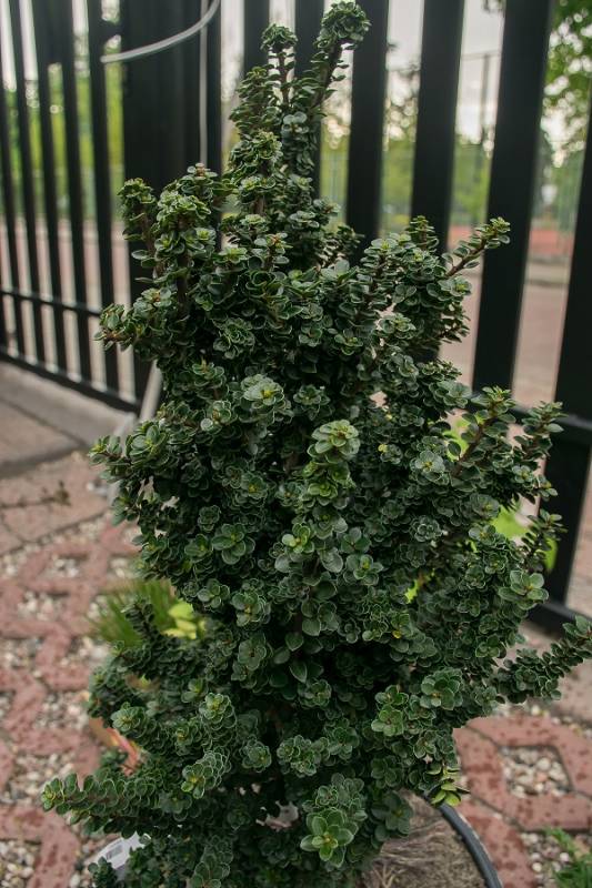 Zimozielony, gęsty krzew o wąskim, wyprostowanym pokroju i umiarkowanej sile wzrostu, po 10 latach około 3-4 m.