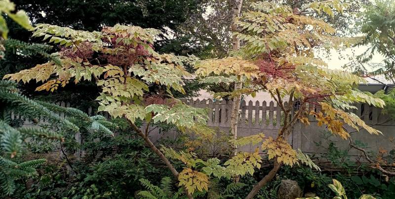 Aralia elata 'Aureovariegata' ładnie otrząsnęła się po wiosennych przemrożeniach: