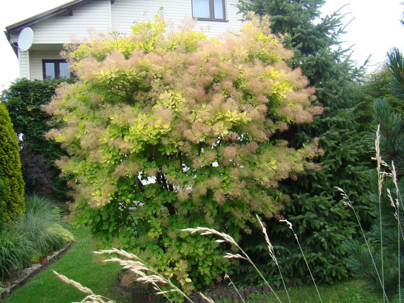 Trzeci stoi przy samym parkanie, fotki robię więc od strony sąsiada (od strony mojego ogrodu przesłania go „Purpureus”, którego peruki widoczne są za nim). Jego własne peruczki aż tak dobrze nie kontrastują, są rzadsze, ale są.