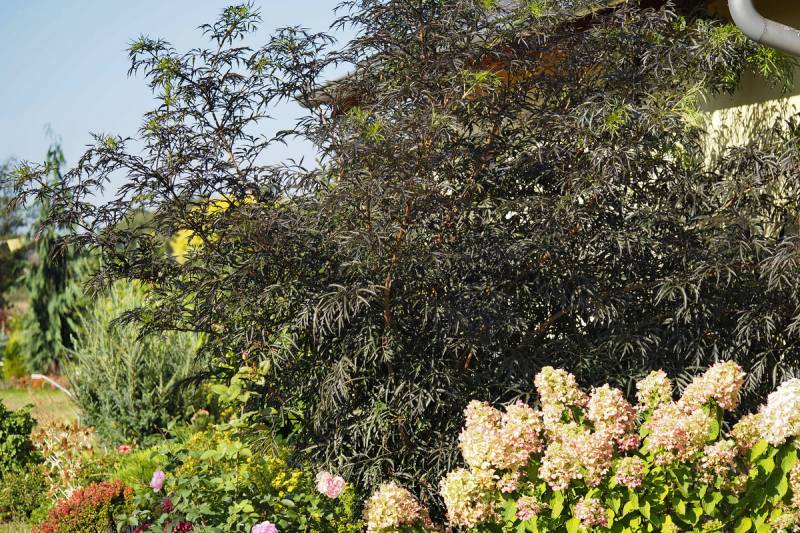 Bez czarny Black Tower, u nas drugi sezon, rośnie bardzo szybko, ma mocne i wyprostowane łodygi, bardzo długo utrzymują się na nim liście. Zdjęcie z końca października.