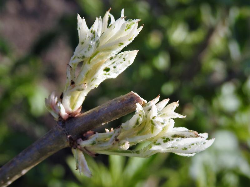Bez czarny 'Pulverulenta' wczesną wiosną przycięłam dość mocno w celu zagęszczenia młodego krzewu. Zaczyna pokazywać się coraz więcej bieli na liściach.