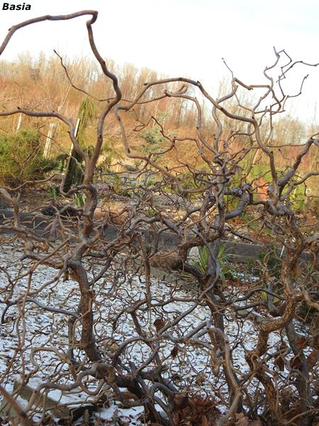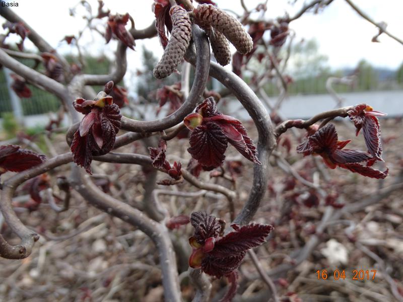 Leszczyna pospolita w tle czerwonolistnej odmiany. Obie były sadzone w jednym czasie a różnica w ich rozmiarze jest wielka