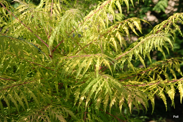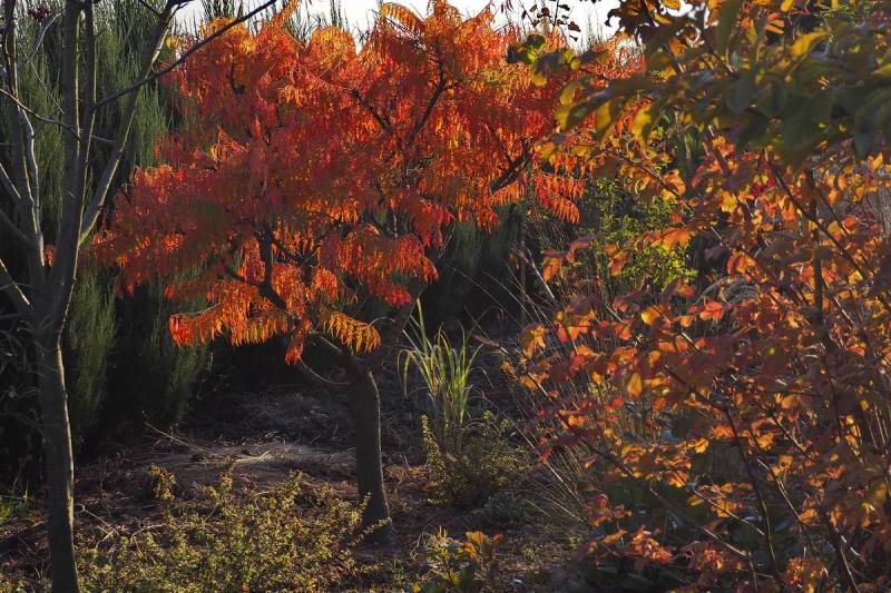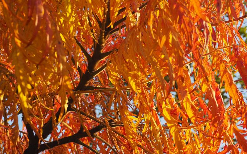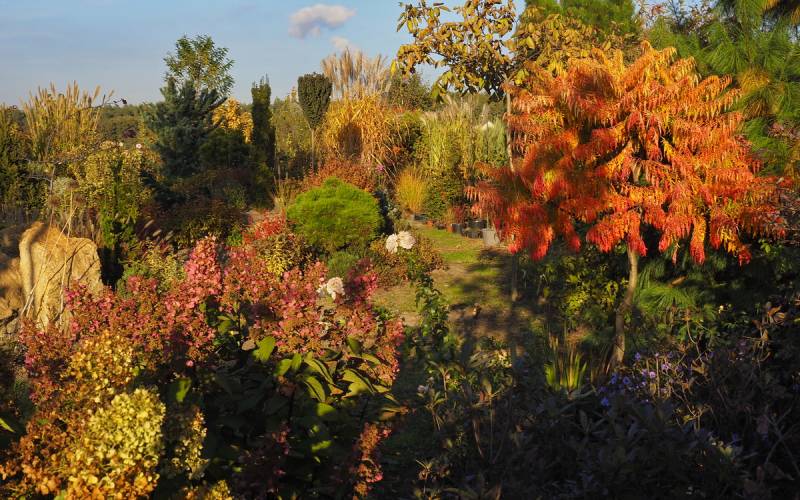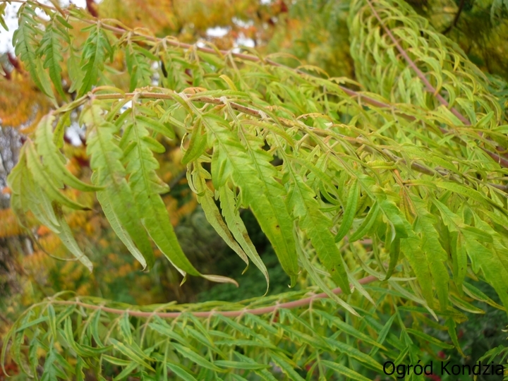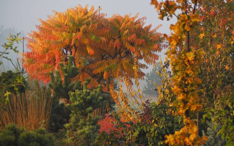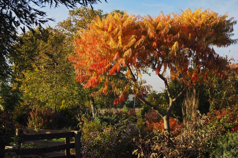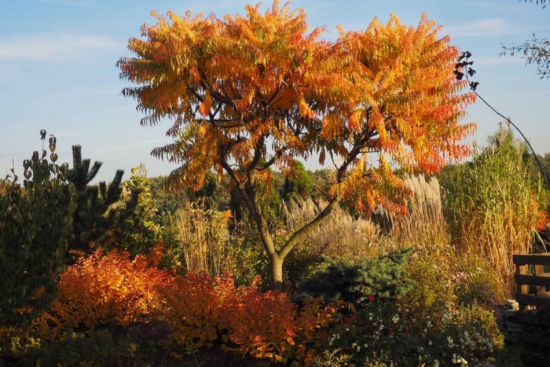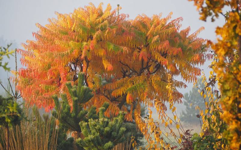 Rhus typhina, spotkać możemy w ogrodach sumaki odmianowe, różniące się kształtem i kolorem liści: