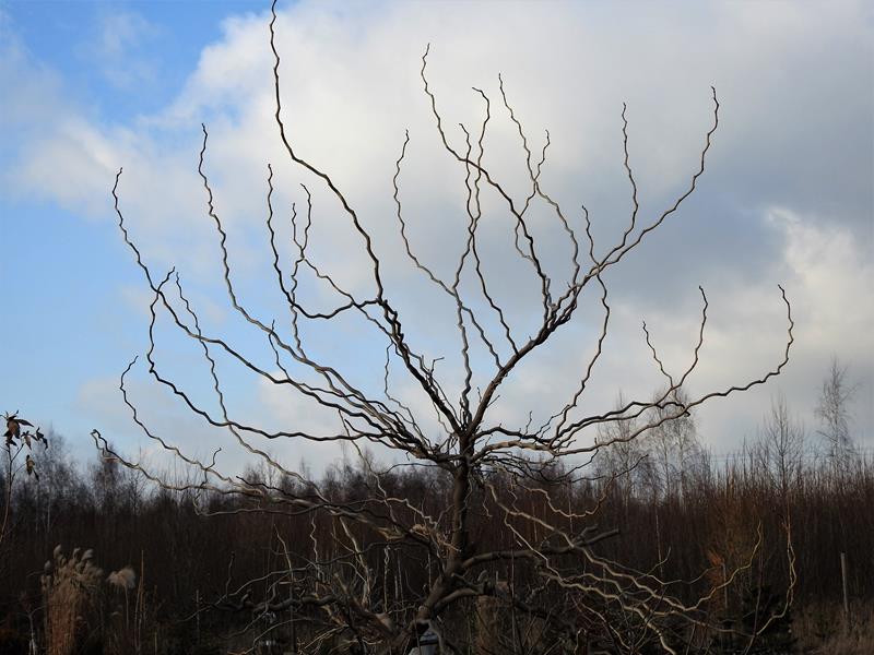 Szybko rosnące, duże drzewo dorastające do 9 m wysokości, o zygzakowato pogiętych pędach ( dobrze widocznych w okresie bezlistnym) i owalnej, parasolkowatej koronie.