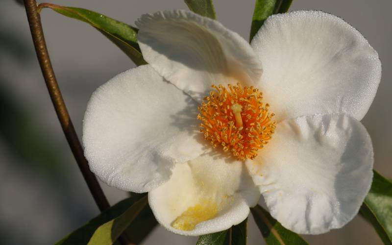 Kwitnienie: kwiaty białe z licznymi, złoto-żółtymi pręcikami, do 8 cm średnicy; pojawiają się najczęściej od połowy września do mrozów; wydzielają słodki zapach, przypominający zapach cytrusów
