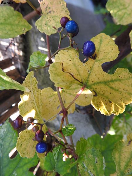 Mimo dość ciemnego stanowiska, mój winnik zmienny 'Elegans' zakwitł i zawiązał kilka owocków. Wczoraj został przesadzony na słoneczne stanowisko. Zobaczymy, czy ruszy z wigorem i czy doczekam się obfitości 'porcelanowych' koralików. :nie_wiem