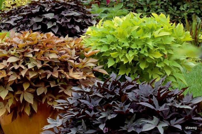 wilec ziemniaczany, batat (Ipomoea batatas), jadalny o sporym znaczeniu gospodarczym, ale i pięknym, gęstym ulistnieniu.