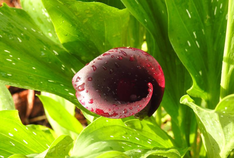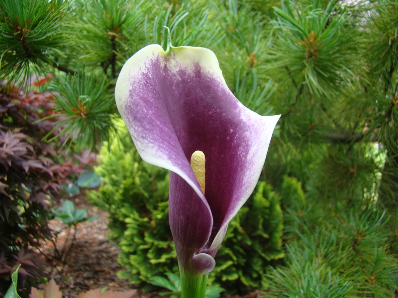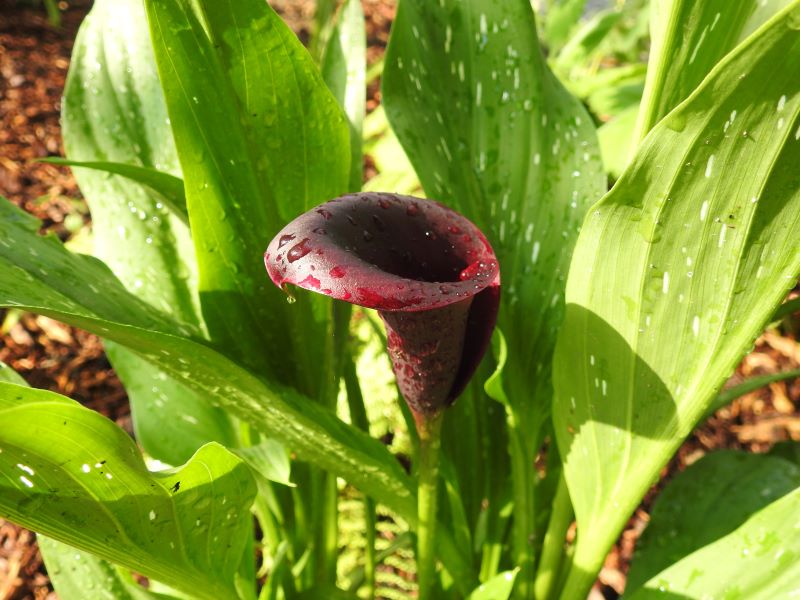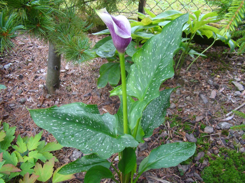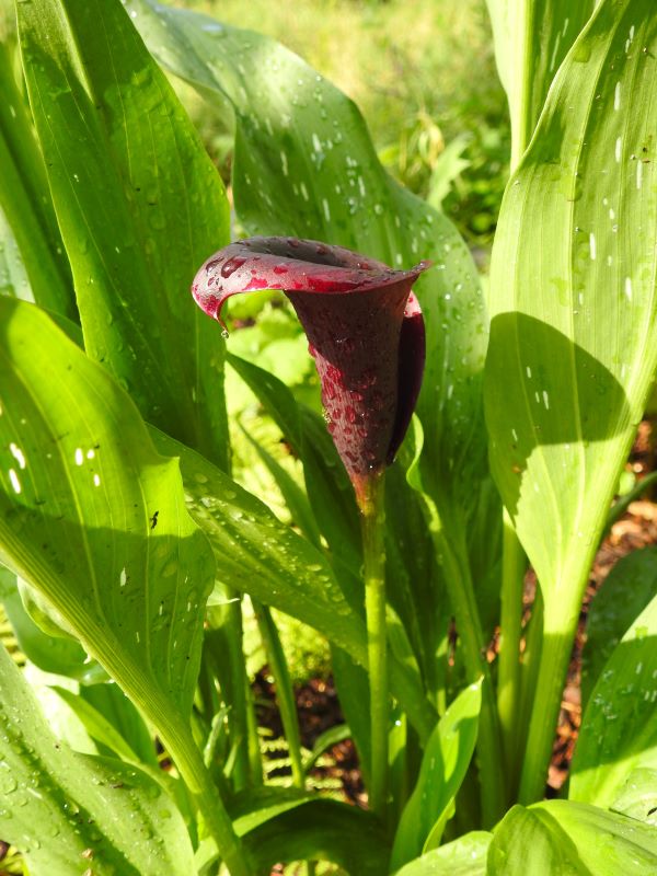 Kwiatostan przypomina kwiatostan anturium – składa się z pięknej, dużej kolby, a ona z kolei jest owinięta (otoczona) charakterystyczną łódkowatą pochwą.