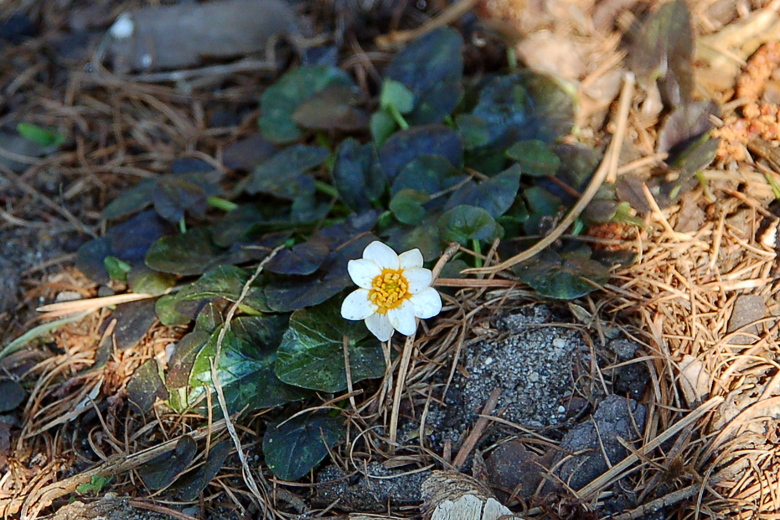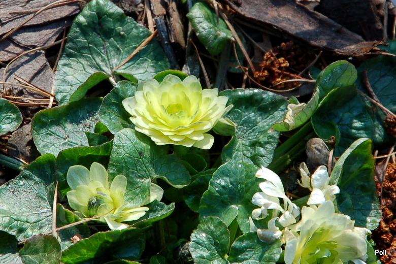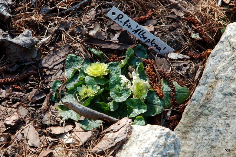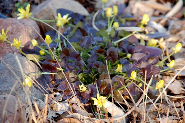Ficaria verna 'Collarette' o żółtych, pełnych kwiatach, rośnie pod hostą, w często podlewanym miejscu. Wiosną ma dośc słońca, które bardzo lubi i które zapewnia mu obfite kwitnienie.