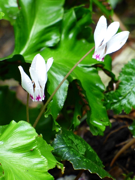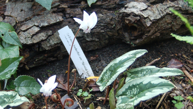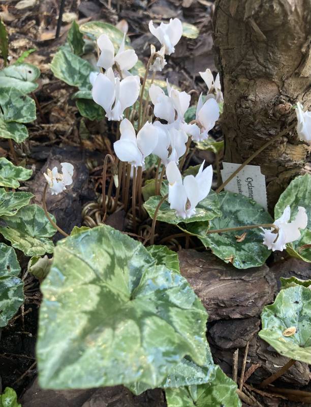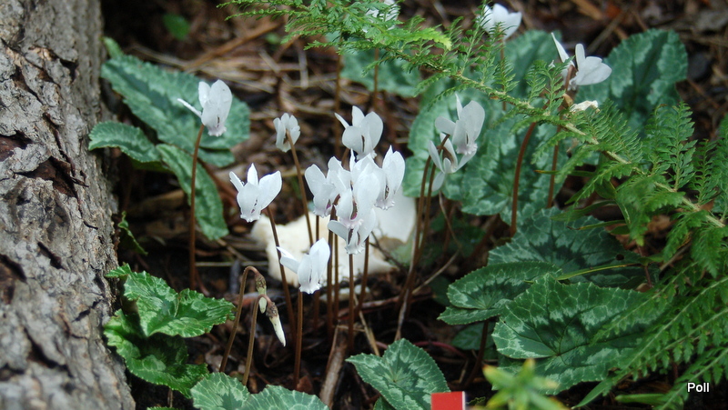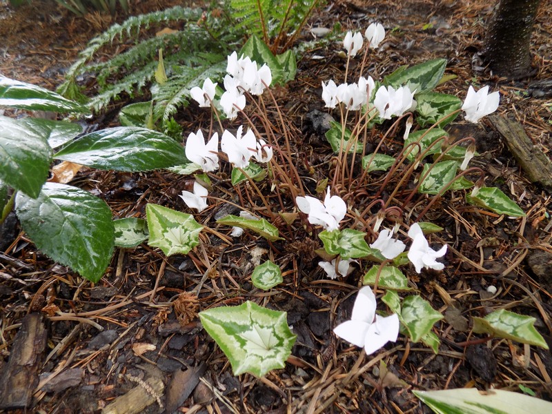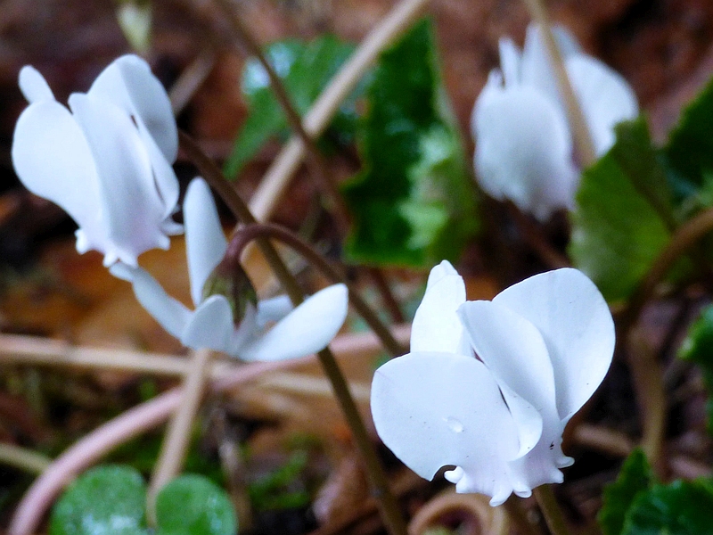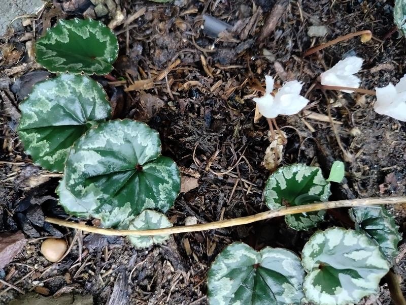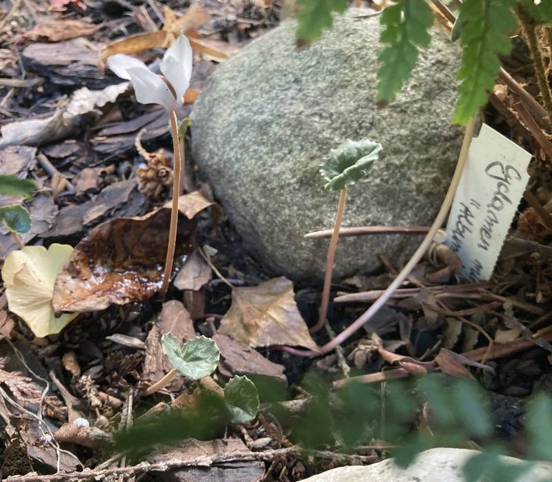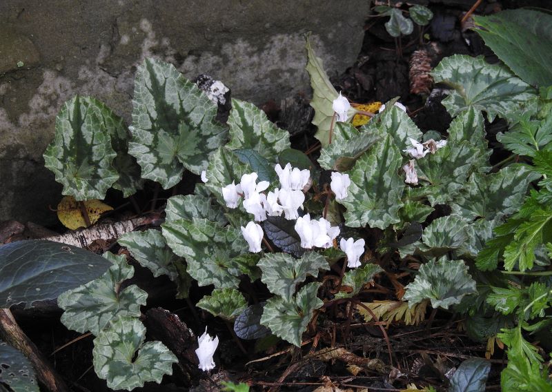 Cyclamen hederifolium 'Silver Leaf Alba' kwitnie dużo, dużo skromniej i dopiero niedawno zaczął produkować liście