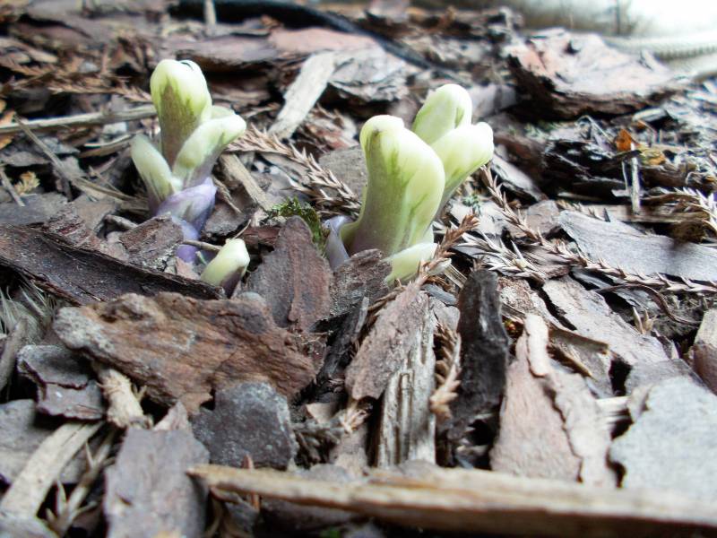 Porównałam sobie zdjęcia z poprzednich lat i u mnie stan hostowych kłów jest podobny do ubiegłorocznych. Mimo ciepła, wcale nie widać jeszcze wielu host. Właściwie to dopiero wychylają się te, które są zadołowane w donicach.