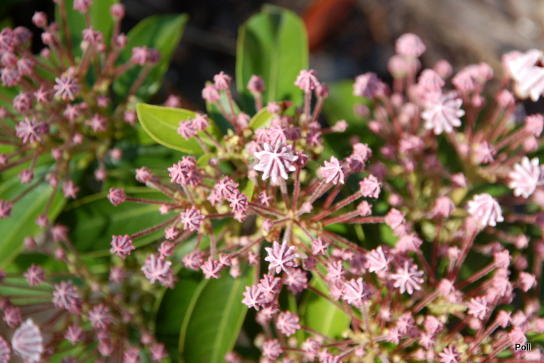 Ewa w połowie czerwca wytwarza charakterystycznie pokarbowane ciemno-różowe pąki zebrane w duże baldachogrona (nawet po 180 kwiatów), z których rozwijają się miseczkowate,