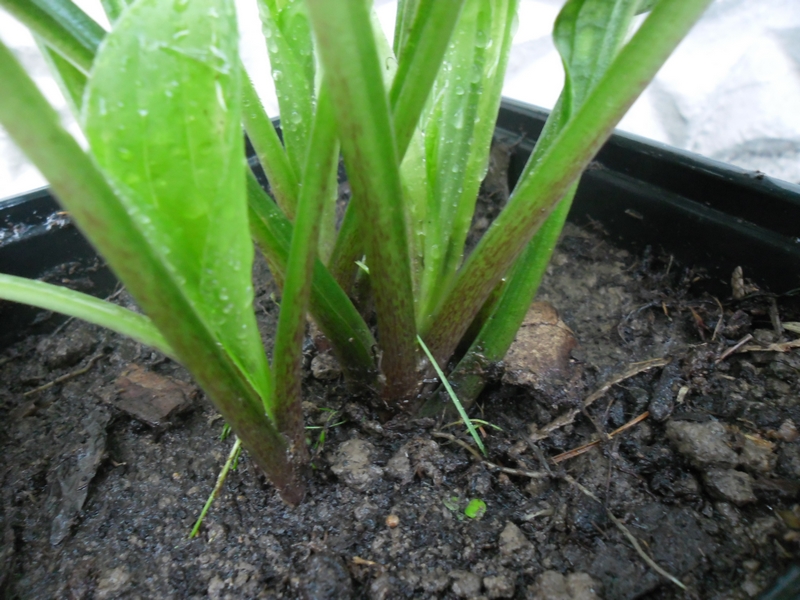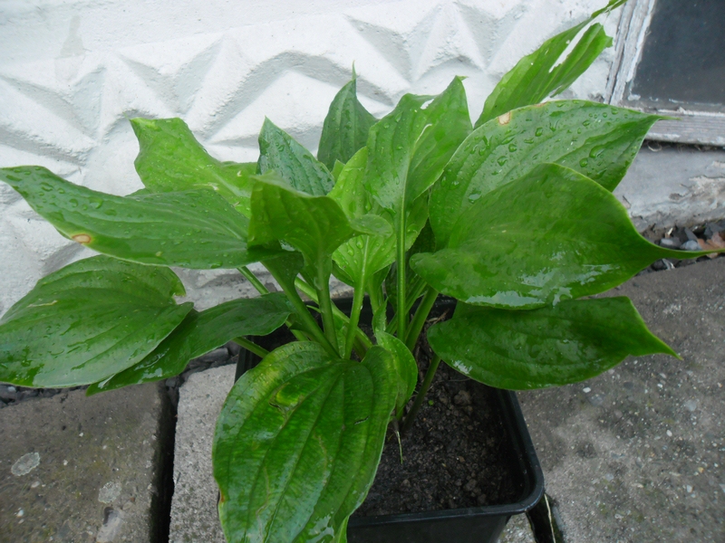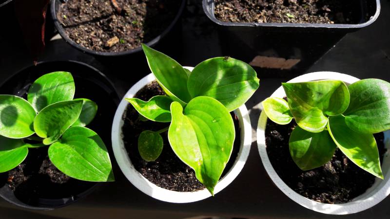 Hosty wysiane w zeszłym roku do doniczki i zadołowane na zimę w gruncie.,zaczęły wychodzić końcem maja ,