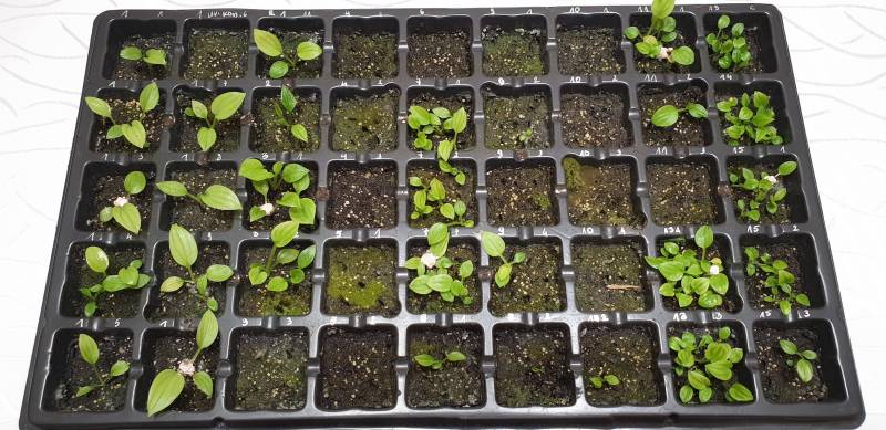 W ubiegłym roku miałem garść nasion z host rosnących przy fontannie, ogrom nasion nie wykiełkował, te które kiełkowały są bardzo do siebie podobne, mają ciekawy kolor (wszystkie są w tym samym kolorze) i kształt liścia. Ich wielkość też jest zastanawiająca. Te siewki są w polach oznaczonych cyfrą 20.