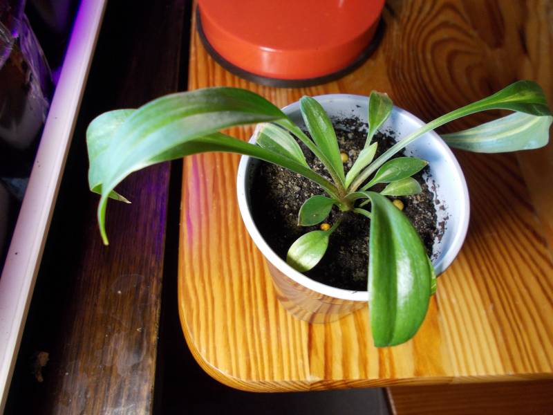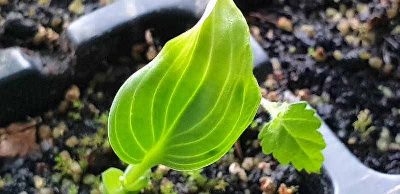 Grzegorzu , siewki są tak zmienne ,że po pierwszym drugim , czy trzecim liściu jeszcze za wiele nie można powiedzieć , jaka będzie . Pierwsze listki przeważnie są zaokrąglone . Na poniższym przykładzie widać ,jak wyglądały pierwsze liście ,a jakie urosły później . Ta siewka , też miała pasemko na jednym liściu , a teraz jak podrosła , to tylko jeden listek ma przebarwienie , a jeszcze jakie wydłużone liście wyrosły .