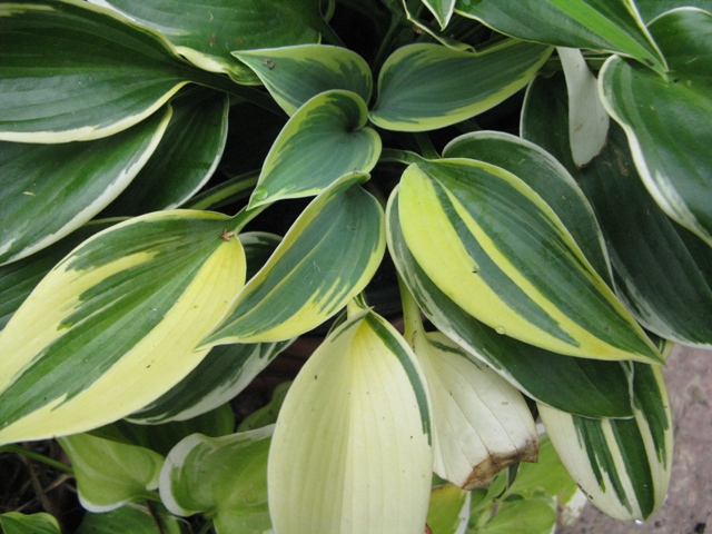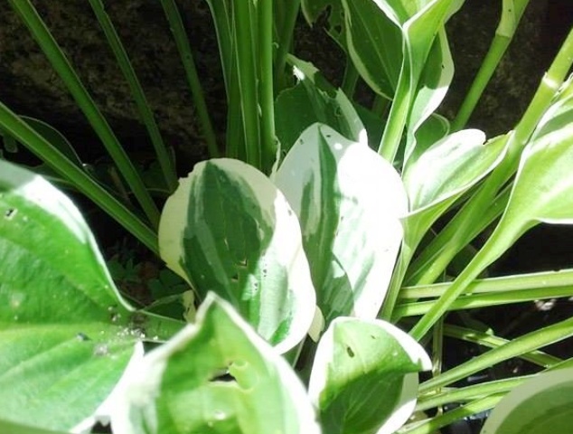 Hosta 'Diamond Tiara' z odrostem ze znacznie szerszym białym marginesem...i dużo bardziej jasnymi ogonkami liściowymi...trzeba dzielić!