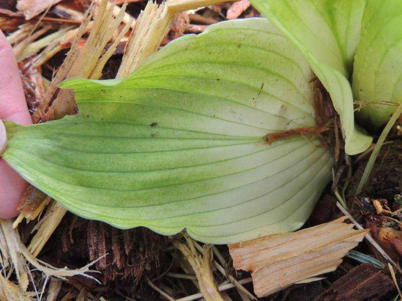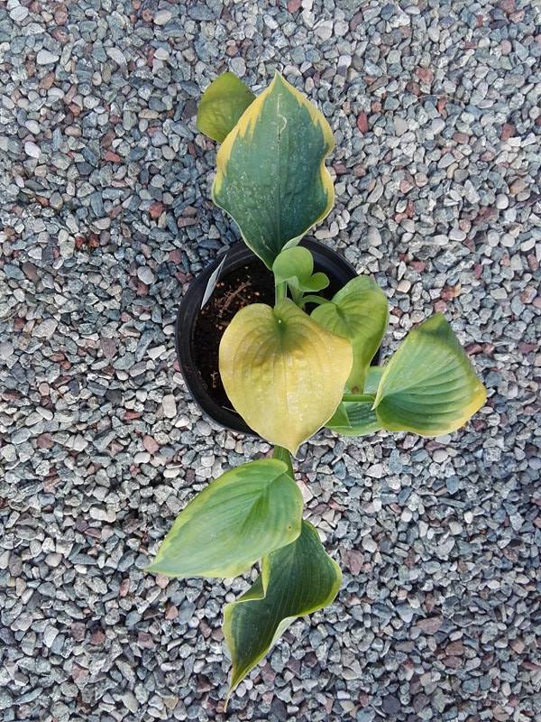 Hosta 'All That Jazz' młody odrost z dziwnym liściem i nóżkami w zupełnie inny kolorze...